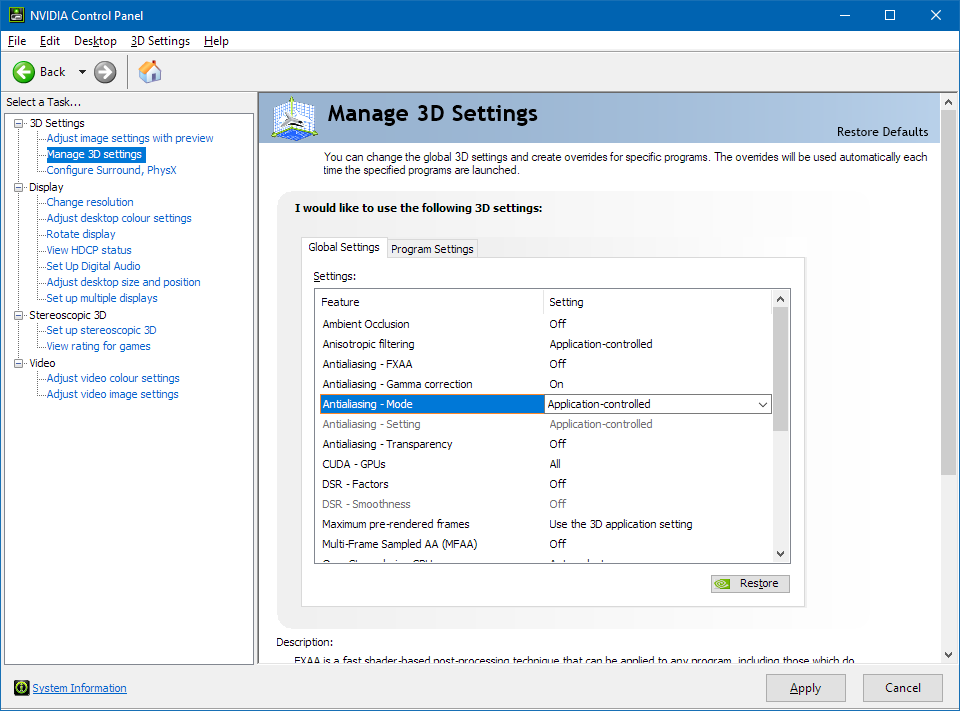3. Change the Anti-Aliasing mode in the Global Settings list to "Application-controlled" as shown below and click Apply.