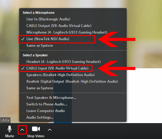 Next we will configure the Zoom video source. Select the arrow next to the camera icon in the bottom left corner. Then choose the Newtek NDI Video option.