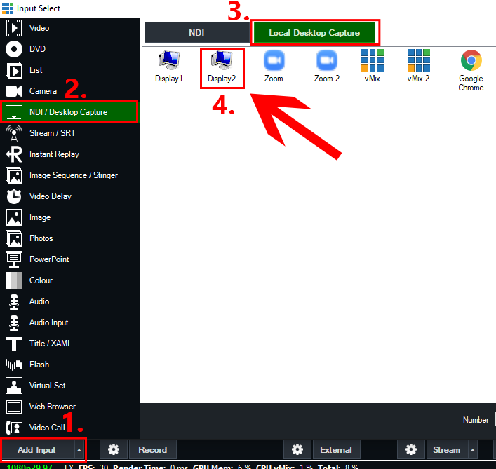 Once your guests have joined your Zoom meeting, we can now add them into vMix. To add the video, select the Add Input button from the bottom left corner. Then select the NDI / Desktop Capture tab. Choose the Local Desktop Capture button from the top. From here, we need to select the corresponding display number that you have Zoom currently displaying on. If you have two monitors, this will usually be Display2. Select the Display2 option and press OK. (Note: Do not select the Zoom program option as direct capture is not supported).