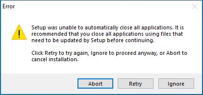 "Setup was unable to automatically close all applications. It is recommended that you close all applications using files that need to be updated by Setup before continuing."
