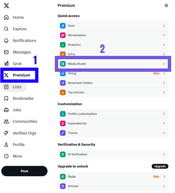Log into your X account, then click on the Premium tab and then click on Media Studio.