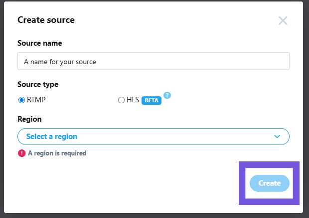 You will then need to create a new Stream Source. Give it a name, select RTMP and then choose your nearest connection point. Click Create.