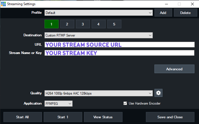 Then select Custom RTMP. Then enter the Stream Source URL and the Stream Key. You can adjust the streaming quality settings by using the drop-down or clicking the gear icon. Ideally you should select to use the Hardware Encoder if you have an NVIDIA GeForce card. Then you can click Save and Close.